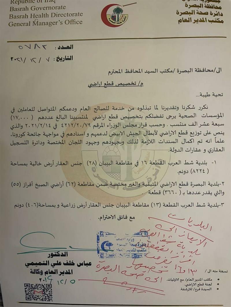 محافظ البصرة يوجه بتخصيص قطع أراضي للكوادر الصحية (وثيقة)