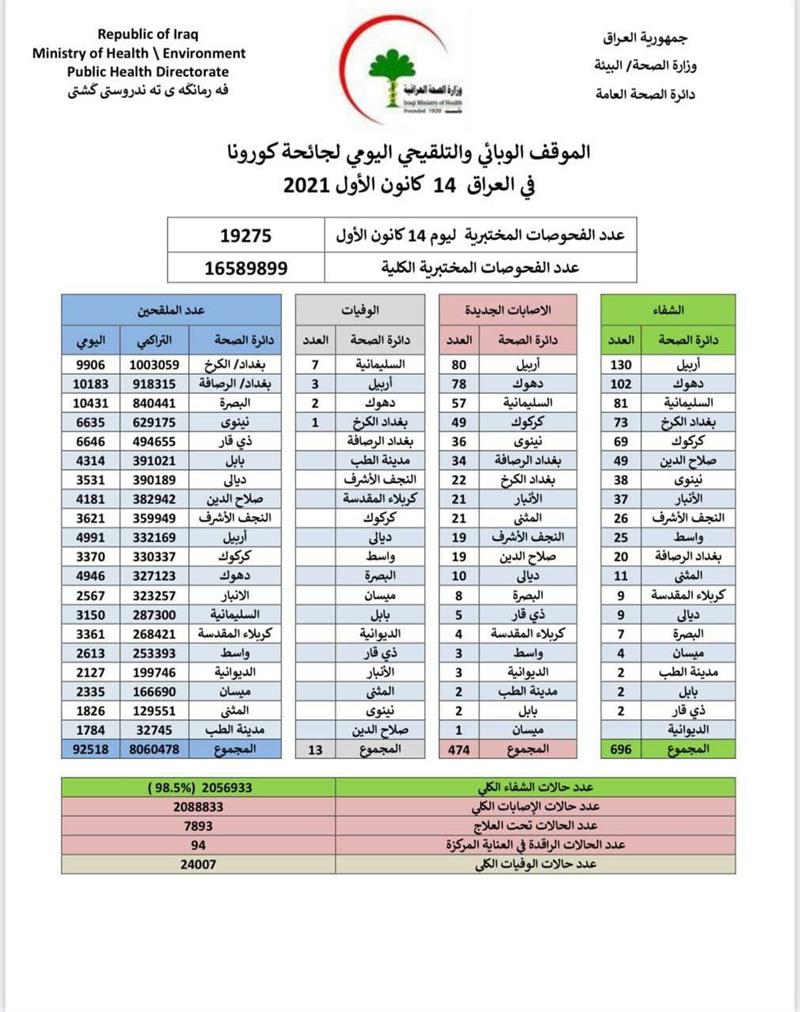 الصحة العراقية تنشر الموقف الوبائي اليومي لجائحة كورونا