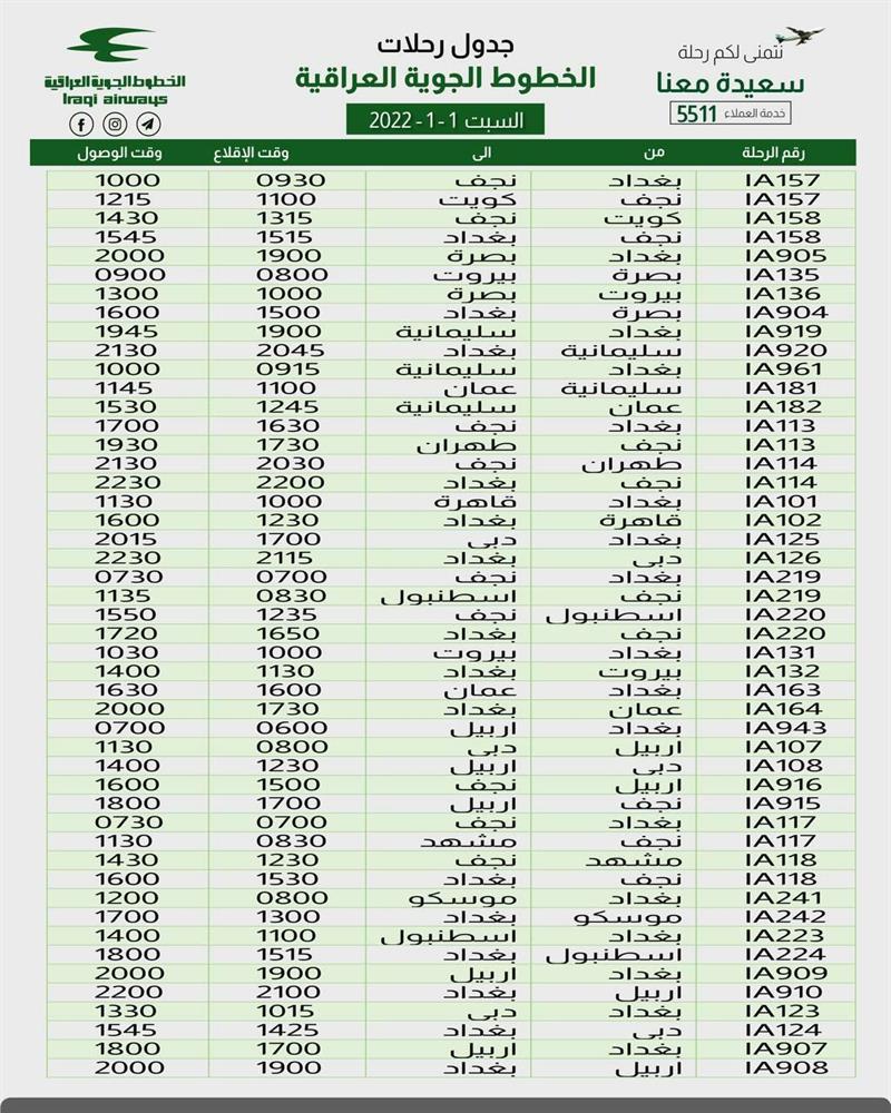 جدول رحلات الخطوط الجوية العراقية الداخلية والخارجية ليوم غد